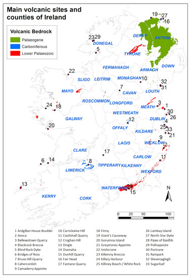 This review covers the volcanic geoheritage mainly in Ireland (ROI). As a part of the United Kingdom, Northern Ireland has its own scheme of statutory ASSIs—Areas of Special Scientific Interest (very similar to the statutory Sites of Special Scientific Interest (SSSI) defined under the Geological Conservation Review in England, Scotland and Wales). There is a range of sites with different interests in Northern Ireland, but in Country Antrim, especially, there are numerous sites associated with the Paleogene volcanism of circa 60 million years ago during an initial phase of rifting related to the opening of the North Atlantic Ocean.