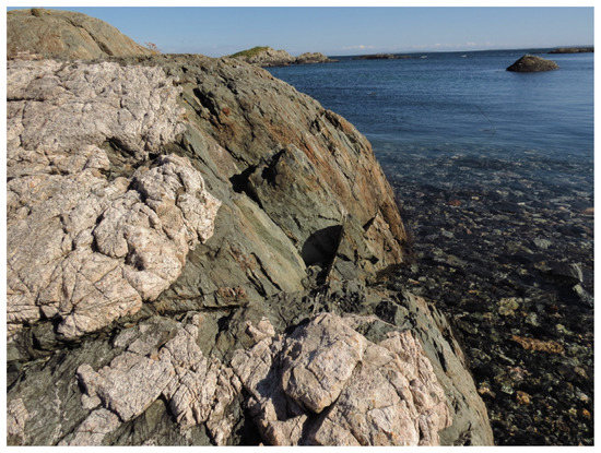 County Donegal has some of the most complex geology in Ireland, dominated by Precambrian Dalradian metasediments and Caledonian granite bodies that were emplaced along major crustal faults. Purely volcanic features are relatively few but new airborne geophysical mapping by Tellus [42] shows that the northwest–southeast-trending Palaeogene dolerite dyke swarms that are a prominent feature of the Antrim basalt plateau extend across Donegal and into the Atlantic seabed. A notable example is the Blind Rock sub-vertical dolerite dyke on Doorin Point peninsula [43]. It is interpreted as a composite feeder dyke that supplied now eroded, formerly overlying volcanic rocks, in several pulses of intrusion during the opening of the North Atlantic Ocean. Fittingly, the main exposure of the dyke extends into the Atlantic Ocean in Donegal Bay. Blind Rock is easily accessible and is the best exposure in Ireland of this type of composite dyke. The audit recommends its wider promotion through a visitor information panel.