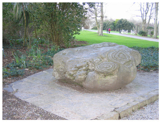 One of the easiest single features with which to explain volcanic rocks to the public is found in the grounds of Ardgillan House (Figure 5) [14] on the north coast of County Dublin. The house is owned by Fingal Council and run as a public park and visitor attraction. On the route between the car park and the House is a large boulder which was collected from a nearby beach, in the mistaken impression that its concentric circular patterns were some ancient Celtic carvings. They are in fact the weathering pattern of pillow lavas from Ordovician volcanoes that erupted in the area some 460 million years ago. However, despite suggestions made in the CGS report, no interpretation or explanation is available on site, yet it provides opportunities to tell several fascinating stories in a publicly accessible and eye-catching location. The boulder reveals not only its geological origin as volcanic lava erupted underwater, which is evidence of the closure of the Iapetus Ocean, but also a more recent history of movement at the hands of people.
