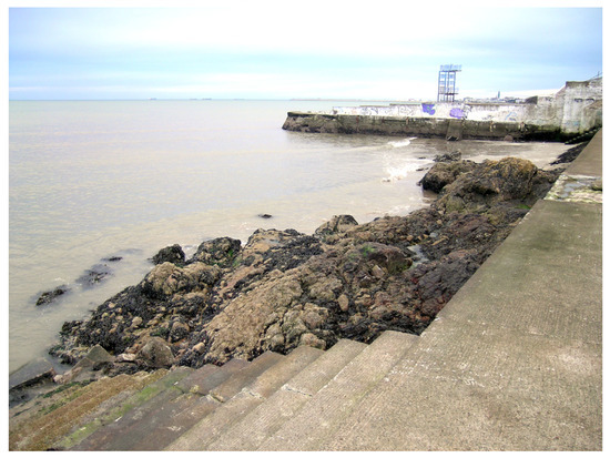 In south County Dublin (Dun Laoghaire-Rathdown) the Blackrock Breccia (Figure 16) [55], which occupies a distinctive small area (approximately 30 m by 13 m) in the intertidal zone at Blackrock village, is an explosion breccia, composed of angular fragments of granite set in a matrix of finely broken granite. No junction or boundary with another rock type is seen. The rock is interpreted to have formed in the later stages of the intrusion of the Leinster Granite when an upsurge of an explosive gas phase fragmented granite that had already formed. It is included in some popular guidebooks but there is much more potential to tell the story of this rock which is immediately beside the coastal path. Constant washing by the sea keeps the exposures free of algae, seaweed and other material.