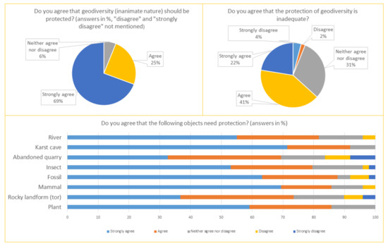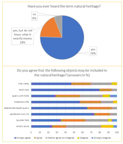 The term “geodiversity” is unknown to approx. 25% of respondents; over 40% of respondents know the term and are able to explain it. The rest of respondents (35%) have heard the term, but they do not know its exact meaning. 95% of respondents agree that geodiversity should be protected, however, the respondents prefer the protection of living nature (plants, mammals and insects); concerning abiotic nature, the karst features are considered as the most worthy of protection and conservation. 63% of respondents state that the geoconservation is not sufficient and that it should be supported somehow. Approximately half of the respondents state that they know some legislative tools for the geoconservation; they usually gave the examples as “Natural Monuments”, “National Parks” and “Geoparks”. Only a few of them mentioned lower categories of nature protection (which are also applicable to geosites)—Important Landscape Element or Natural Park, which (according to Act n. 114/1992 Coll. [42]) protect the landscape appearance. No respondent mentioned the general protection of the caves, fossils and mineral deposits defined in Act n. 114/1992 Coll. and included in the general nature conservation. The detailed results are presented in Figure 2.