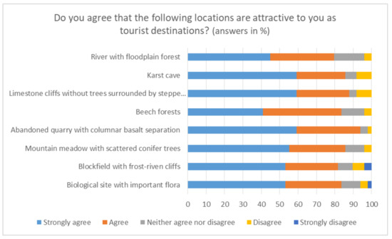 The third part of the questionnaire included a set of pictures that represented potential tourist destinations situated in the Czech Republic. All were natural, some of them included mainly the abiotic nature elements, some of them displayed biological sites, and some of them represented both aspects. They were the following: (1) a biological site with important flora, (2) blockfield with frost-riven cliffs, (3) mountain meadow with scattered conifer trees, (4) abandoned quarry with columnar basalt jointing, (5) beech forests, (6) limestone cliffs without trees surrounded by steppe vegetation, (7) karst caves, and (8) river valley with floodplain forest. The visit preferences of the public were not determined. However, the karst cave, aesthetically valuable basalt quarry and limestone cliffs slightly prevail. For detailed results, see Figure 4.