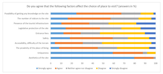 The last section was focused on the factors or criteria that may affect the tourist’s or visitor’s choice. For the assessment, the following factors were considered: (1) aesthetics of the site, (2) uniqueness, (3) the proximity to the place of living, (4) accessibility, difficulty of the terrain, (5) safety, (6) entrance fees, (7) legislative protection of the site, (8) presence of the tourist infrastructure, (9) the number of visitors to the site, and (10) possibility of obtaining any knowledge on the site.