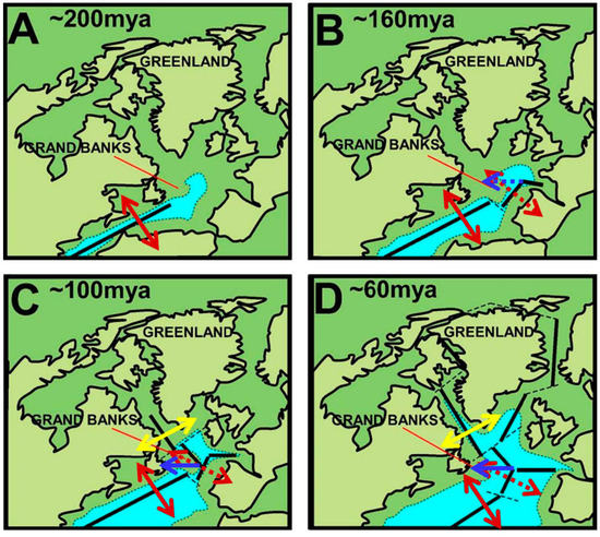 The first rifting phase–referred to as the Tethys Phase [1,2,5]–began approximately 200 Ma during the Late Triassic and lasted until the Early Jurassic (Figure 2A). This early sequence caused roughly southwest-northeast striking rifts, splitting North America apart from Africa as well as defining many of the basinal structures seen in the Grand Banks [10]. Due to the extensional stresses oriented perpendicular to the rifting direction, blocks faulted and rotated, forming half grabens which stacked successively against larger seaward-dipping listric faults such as the Murre and Mercury (Figure 1), and from this the basins were formed [2,11]. Of these basins, the Jeanne d’Arc (Figure 1, inset) represents the deepest extensional zone on the continental shelf, and this early rifting episode introduced clastic sediments, evaporites and basalts. Later, marine transgression in the Jurassic brought deposition of limestones, dolomites, sandstones and shales [5,12].