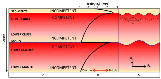 Idealized scheme depicting (A) lithosphere competency with increasing depth, (B) Strength profile redrafted with values from [49] and (C) conceptual effects of boudinage in the upper crust and lower crust/upper mantle region, in an anisotropic extensional regime case.
