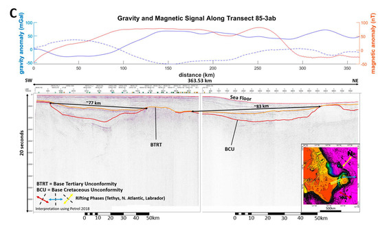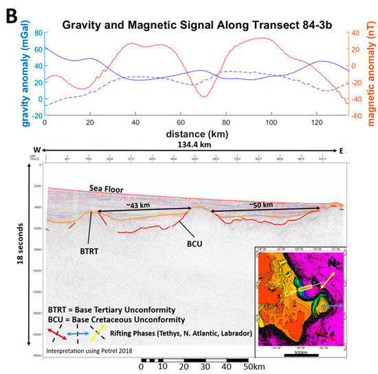 Interpretation of Lithoprobe line segments [54,55,56] and corresponding uncorrected (dashed, blue lines) and bathymetry-corrected (solid, blue lines) free air gravity, as well as magnetic anomaly (red) signatures along transects. Estimated observed boudinage wavelengths before corrections outlined in Section 3.2. Insets display location of transects within the Grand Banks region. (A) 87-2b, features aligned with extension related to the Tethys rifting phase (approximately 200 Ma) (B) 84-3b, features aligned with extension related to North Atlantic rifting phase (approximately 160 Ma) (C) 85-3a and -3b, features aligned with extension related to the Labrador rifting phase (approximately 120 Ma).