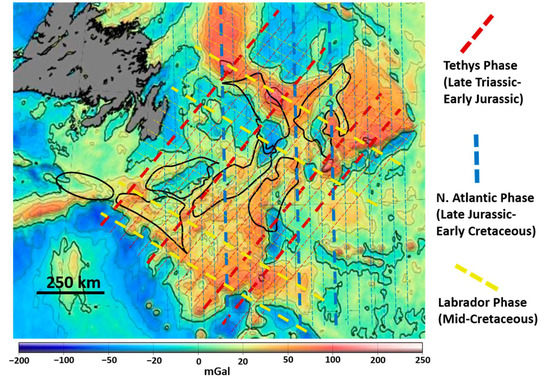 1 arc-minute resolution gravity anomaly map of the Grand Banks with elongated structures highlighted by dashed lines spaced 50 km apart. Colors of lines correspond to rifting episodes indicated on the right and are parallel to each rift axis orientation. Bold lines indicate better qualitative fit. Basin footprints adapted from [5], global gravity anomaly data from [57].