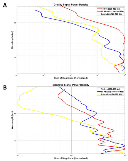 Six lines of potential field data were extracted from grids across the Grand Banks, three from a free air gravity anomaly grid and three from a magnetic anomaly grid, provided by the GSC [63,64]. The resolution of the data used is 2 km, however the data was interpolated onto a 1 km grid. Lines were chosen orthogonally from the three separate rifting axes in the North Atlantic, as shown in Figure 7. After a Fourier analysis was performed on data along these lines (padded by end-member value for twice the profile distance on either side), dominant wavelengths between 20 and 250 km were observed. These values varied by line orientation and data type, with the shorter wavelength features dominating the magnetic signal corresponding to the Tethys phase, and moving counterclockwise, the longer wavelengths became progressively more dominant. The gravity data corresponding to the Labrador phase exhibit spikes around 16 and 45 km and otherwise have very high magnitudes of >200 km wavelengths. The North Atlantic phase gravity spectra appears to indicate a number of spikes, one located just under 40 km and others ranging anywhere from 80 to 200 km. Lastly, the Tethys phase gravity data was dominated by peaks of similar magnitude ranging anywhere from 30–100 km with little sign of signals elsewhere. These findings are summarized in Table 2. Figure 8 shows the unfiltered spectral signatures for the Tethys, North Atlantic and Labrador phase gravity and magnetic anomaly data for comparison.