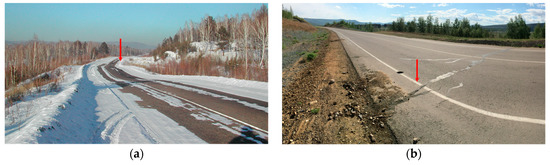 The aim of the presented investigation was the scientific substantiation of a new technique for electromagnetic monitoring of permafrost under highways, which is a serious problem in the territory of Russia. The operation of highways built on frozen ground is characterized by a high capital intensity attributed to constantly occurring deformations of the roadbed, requiring reconstruction work and measures to stabilize the permafrost-affected environment [28]. As a rule, the cause of such deformations is the ground ice melting and the formation of thaw bowls at the road base, giving rise to thermokarst. The evolution of thermokarst goes on for several years, and sometimes for decades, which leads to significant financial costs to maintain the road in a condition that meets the necessary standards. For instance, 5 years after the start of operating the R-297 ‘Amur’ federal highway (Chita-Khabarovsk), in the Amur Region alone there were more than a hundred of the so-called irreversible deformations (subsidence) of the roadbed, with lengths of 10–40 m [29]. In the Trans-Baikal Territory, an example of the long-term subsidence is the road segment from the Amur highway to the Peschanka settlement on the outskirts of Chita (Figure 1), which has been experiencing deformations since the 1980s (Figure 2a).