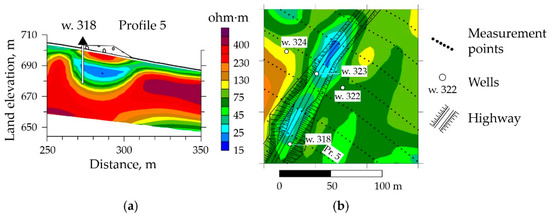 Fragment of the geoelectric section along the profile 5 (a) and that of the resistivity distribution map at a 15 m depth (b).