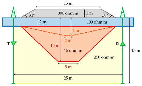 We propose a technique for monitoring permafrost under highways, based on the pulsed electromagnetic cross-well exploration of the geological space. With account taken for the above-described resistivity inversion results, the following geoelectric model and cross-well system parameters are considered in sectional view (Figure 4). At the top, there is a 2 m high trapezoidal roadbed with embankment (gray). Its upper base is 15 m long, and the length in the plan is 30 m (not shown in the Figure 4). The base angles of the trapezoid are 30°. The electrical resistivity of the road element under examination is equal to 300 ohm∙m. Below, there is a seasonally thawing rectangular layer (blue) with a height of 2 m and a resistivity of 100 ohm∙m. Permafrost (yellow) is characterized by a resistivity of 250 ohm∙m. The indicated geoelectric parameters are in a good agreement with the results of electrotomography field data interpretation.