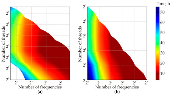 We analyzed the algorithm performance for two types of the cluster nodes, while varying the number of frequencies at which the signals of the sounding system were simulated in parallel, as well as the number of computational threads on which the problem was solved for a specific frequency [39] (Figure 5).