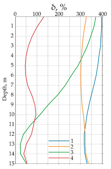 Let us consider the relative differences between the EMF in the reference model and those with a talik (Figure 7; 1, 3—small talik and 2, 4—large talik) as a function of depth along the well. The first two (1 and 2) are obtained at the short time t1 = 2∙10−7 s, while the second pair (3 and 4) is attributed to the late time t2 = 10−6 s. A careful examination reveals the pairwise differences between the graphs 1, 2 and between 3, 4 to be significant, especially for the time t2. The exception is the maximum depths, where the measuring system sensitivity to the taliks is practically absent subsequent to their remoteness.