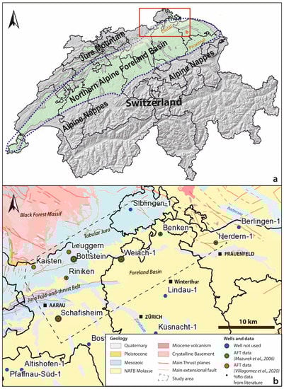 This work focuses on the area located in the distal part of the Northern Alpine Foreland Basin (NAFB) (Figure 1a), in the north-eastern sector of Switzerland and extended throughout the Cantons of Aargau, Zürich and Thurgau (Figure 1b). Several studies were conducted in this area, for characterising the shallow and deep subsurface, initially for coal and hydrocarbon exploration, and later for nuclear waste storage []. The interest in this area has been recently renewed for both shallow and deep geothermal energy exploration and geological storage of CO2 []. For proper and safe use of the subsurface, it is necessary to understand the present and past temperatures attained by the rocks, as well as to understand the tectono-stratigraphic evolution of the area. For these purposes a fundamental step is to estimate the thickness of the deposits eroded during the evolution of the basin. These data from the stratigraphic record enable one to (i) define the original basin geometry, (ii) quantify the uplift and denudation rates, thus the tectonic activity in the area, and (iii) calculate the maximum burial and thus the maximum temperature attained.