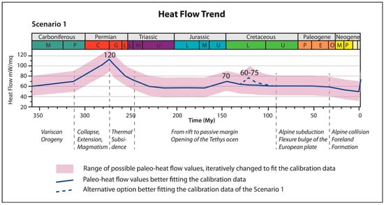 An important thermal surge, with heat flow up to 100–120 mW/m2 is placed in the Early Permian, expressing the thinning and delamination of the lithosphere and the magmatic activity characterising this period [,]. This is followed by a gradual decrease of heat flow associated with thermal subsidence, reaching values of 50–60 mW/m2 through the Triassic. In the Jurassic the heat flow gradually increased as a consequence of lithsophere stretching which affected the European margin during the opening of the Tethys Ocean. A maximum heat flow peak of 65–75 mW/m2 is placed at the Late Jurassic. An additional peak in the Early Cretaceous has been proposed by Mazurek et al. [], which could be related to further extension of the lithosphere and the formation of oceanic crust in the western Tethys [,,,,,,,]. After the Jurassic-Early Cretaceous thermal anomaly, it is assumed that heat flow decreased gradually to values of 50–60 mW/m2 up to the Pliocene, as the basin evolved toward a convergent geodynamic setting, with a gradual thickening of the lithosphere, thus a cooling of the geothermal regime. At 2 Ma, an important heat flow peak up to 75–105 mW/m2 is suggested, in order to be compatible with the present-day high geothermal gradient measured in most of the wells of the area [,,]. These high values, compared to what is expected for a foreland basin, are interpreted as a consequence of advective heat transfer in the deep crystalline basement, with upflows circulating along the Permo-Carboniferous troughs and faults [,].