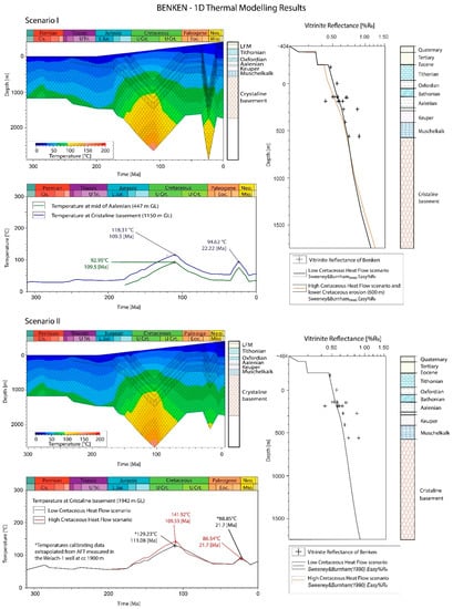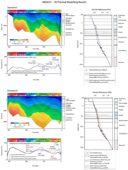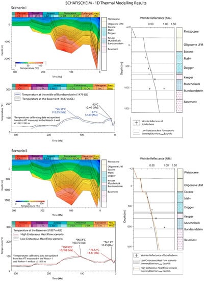 The Schafisheim-1 well is located close to the Fold-and-Thrust Belt Jura (Figure 1). The stratigraphic sequence penetrated by the well is similar to that of the Benken-1 and Weiach-1 wells, with nearly 300 m of Molasse deposits on top of the Jurassic unit (Figure 3). Similar to Benken-1, in Schafisheim-1 the Mesozoic deposits lie directly on the crystalline basement. For Scenario 1 only temperature estimated from AFT data for the Miocene heating event are available []. Therefore, to calibrate the Cretaceous heating, temperatures are extrapolated from the data obtained in the Weiach-1 well in []. In [], no data are available for this well. Therefore, for Scenario 2 the temperatures estimated from the thermal modelling of AFT data obtained in [] in the Riniken-1 and Weiach-1 wells were used.