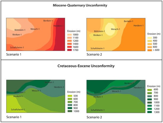 Isopaches maps indicating the amount of erosion estimated for the Miocene-Quaternary and Jurassic/Cretaceous-Eocene unconformities for each scenario.