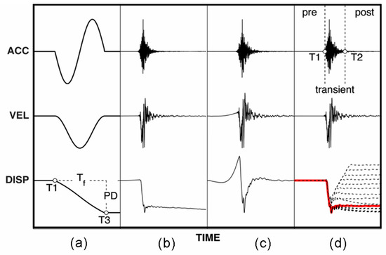 Example of earthquake waveforms processed by means of extended BASeline COrrection (eBASCO) (vertical component recorded at station T1214 during the Mw6.5 Norcia earthquake) from [9]. (a) analytical model of the fling-step in terms of acceleration, velocity, and displacement; (b) uncorrected waveforms; (c) waveforms corrected through a standard processing characterized by broad-band filtering and the application of a cosine taper both at the beginning and the end of the signal; (d) waveforms corrected by the eBASCO tri-linear detrend. Pre-, transient- and post-event windows are highlighted by the T1 and T2 correction points. T3 represents the time at which the ground displacement just reached the final offset. Tf and permanent displacement amplitude (PD) are the period of the sine pulse and the amplitude of the permanent displacement, respectively. Red line: eBASCO ground displacement corresponding to the maximum flatness indicator (f-value); dashed black lines: displacement waveforms corresponding to different T1 and T2 correction points.