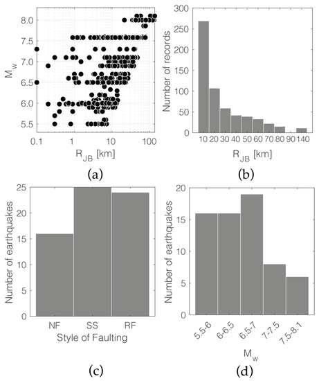 We applied eBASCO to worldwide, near-source, high-quality, strong-motion waveforms archived in NESS [24] and to a selection of other relevant records such as the Mw 7.58 1999 Chi-Chi earthquake (https://gdms.cwb.gov.tw/ (accessed on 29 December 2020)). We processed about 600 three-component waveforms of 65 moderate-to-large earthquakes with (1) moment magnitude between 5.5 and 8.1, (2) hypocentral depth shallower than 30 km, and (3) Joyner–Boore distance up to nearly 140 km. The majority of data are characterized by a fault distance smaller than 10 km and by a moment magnitude in the range 5.5–7.0. Although the prevailing style of faulting is strike-slip, normal and reverse mechanisms are also well represented. A summary of the selected events is reported in Table 1, whereas the distributions of the selected data with respect to distance, magnitude, fault mechanism and magnitude-distance are summarized in Figure 3.