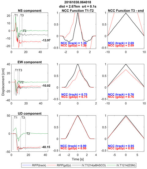 We compare the static offset of the displacement waveforms with nearby geodetic measurements of different moderate-to-large worldwide earthquakes to evaluate the effectiveness of eBASCO (Figure 4). We observe a general agreement between accelerometric records and geodetic measurements, both in terms of amplitude and sense of movement. In addition, we perform a cross-correlation analysis between strong-motion and High-Rate GPS (HRGPS) time series available from the RING (Rete Integrata Nazionale GNSS; http://doi.org/10.5281/zenodo.268045 (accessed on 29 December 2020)) database for the 2016 Norcia earthquake (30 October, 06:40 UTC, Mw 6.5). Such comparison allows assessing the capability of the eBASCO processing scheme to reproduce both the dynamic and static parts of the ground motion. Indeed, we compute the normalized cross-correlation function (NCC) for two different portions of the signals following the procedure described in [26]: (1) between T1 and T2 and (2) between T3 and the end of the signal. The former gives a measure of the similarity of the time histories in the dynamic part of the ground motion, whereas the latter tests the ability of eBASCO to recover the fling step. Figure 5 presents the comparison between the seismic station IV.T1214 and the GPS station RIFP, located only ~2.5 km away from each other. The matching between the EW and UP components is noteworthy, with NCC values very close to one, both in the transient and post-event windows. For the sake of completeness, we report in Figure 5 (green line) the corresponding displacement waveform processed following the standard procedure described in [5] that removes the low-frequency content of the signal. Other comparisons between strong-motion and HRGPS time series are reported in Appendix B.