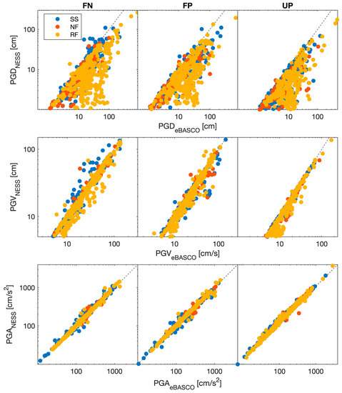 In Figure 6, we compare the peak ground acceleration (PGA), velocity (PGV) and displacement (PGD) obtained from eBASCO with the NESS corresponding values, which are manually processed by applying a second-order acausal time-domain Butterworth filter to the zero-padded acceleration time series and a cosine taper at both the beginning and the end of the signal [5,6]. The aim of such comparison is twofold: (1) to highlight the differences among the two adopted processing schemes, and (2) to test the capability of eBASCO to preserve the long-period ground-motion of near-source records. We show the results in terms of fault-normal (FN), fault-parallel (FP) and vertical (UP) ground motion components, since the fling-step is typically observed along the FP direction for strike-slip faults and along the FN and UP directions for dip-slip faults [7]. As expected, PGAs are insensitive to the different low-frequency treatment of the signal, being related to higher frequencies. Conversely, PGDseBASCO are larger than PGDsNESS because eBASCO preserves the information related to both the static and dynamic displacement. We note a dispersion along the first bisector (45° line) for PGV values also. PGVs are indeed related to intermediate frequencies and as a result, they may be slightly affected by the base-line correction.