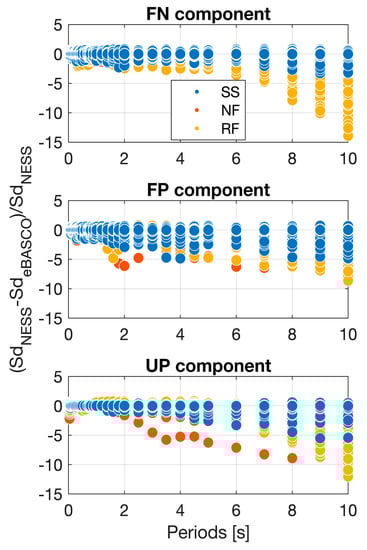Furthermore, we performed a comparison between displacement response spectra (Sd) obtained from eBASCO and NESS (Figure 7). The differences between the approaches amplify as the oscillating period increases, indicating that our processing scheme provides larger spectral ordinates compared to the standard approach. This is a rather expected result as it is well known that the maximum response of an oscillator should approach the PGD value at long periods. The displacement spectra start diverging at T = 2 s and they differ by about 7% (14%, 11%) at T = 4 s up to 88% (74%, 123%) at T = 10 s on average for the FN (FP, Z) component. In terms of fault mechanism, normal and reverse faults show larger discrepancies along the FN and UP directions, whereas strike-slip faults feature larger differences along the FP directions, consistent with the physics of the problem. We find also a dependency on the magnitude: higher magnitude events are characterized by larger differences in terms of Sd values. The figures are not reported here for the sake of brevity.