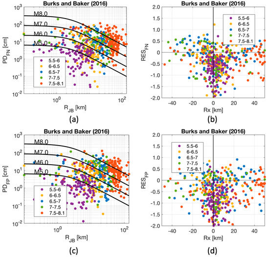 (a,c) Horizontal permanent displacement (PD, FN and FP components, respectively) amplitude versus the Burks and Baker (2016) [23] model (solid lines) expressed in terms of RJB distance for the magnitude range 5.0–8.0; (b,d) residuals computed as the log difference between the horizontal (FN and FP) permanent displacement computed through eBASCO and the Burks and Baker (2016) [23] predicted values. Dots are color-coded based on the magnitude bin.