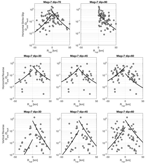 Comparison between fling-step amplitude (Dsite) normalized by the average slip over the fault rupture (Dfault) versus Rrup from the Kamai et al. (2014) [8] attenuation model (black lines) and eBASCO (grey circles), for Mw 7.0, showing the (top) horizontal strike slip, (middle) horizontal reverse, and (bottom) absolute values of the vertical reverse. eBASCO amplitudes are for the maximum horizontal final displacement of the rotated waveforms (RotD100).