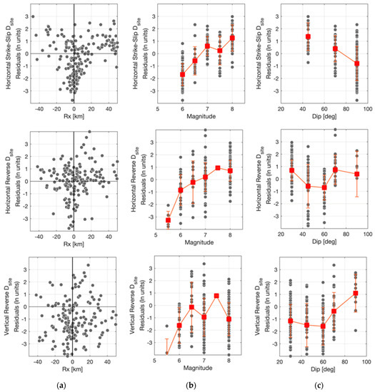 Dsite model residuals versus Rx (a), magnitude (b), and dip (c), showing the (top) horizontal strike-slip, (middle) horizontal reverse, and (bottom) vertical reverse. The grey circles represent individual residuals, whereas the red error bars show the mean and standard deviation for each magnitude or dip bin.