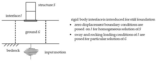 Now, we consider suitable mathematical approximations for , paying attention to the condition on the interface between and , denoted by . The conventional analysis of SSI usually assumes that is an infinitesimally thin and rigid body plate. The restriction ought to enforce the continuity of displacement and traction across ; see Appendix A.