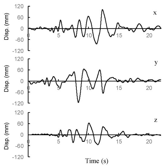 In deriving Equation (17) from the substitution of Equation (16) into Equation (1), we drop a few terms, assuming the symmetry of and . For instance, or is used, based on the assumption that or ( or ) is symmetric or anti-symmetric with respect to a horizontal coordinate, respectively. These integrations represent coupling effects of the displacement functions induced by rigid body translation and rigid body rotation, which vanish if certain symmetry holds for the functions; when is symmetric in the horizontal direction, the displacement function due to the rigid body translation and rotation ought to be symmetric and anti-symmetric, respectively. Therefore, some integrations taken over and are dropped in Equation (17).