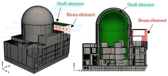 In order to save the degrees of freedom, the authors employed a hybrid model of solid elements and structural elements. Figure 7 illustrates the part to which the structural elements are applied. Shell elements and beam elements are shown as green and red, respectively. The structures with structural elements are rigid or elastic without complex seismic response. The solid elements were applied to the reinforced concrete walls which were against a seismic load which had a possibility to experience a large deformation. Moreover, the model took advantage of multi-point constraints (MPC) at the part of the connection without any damage. As a result, the degrees of freedom were suppressed to 1.5 million.