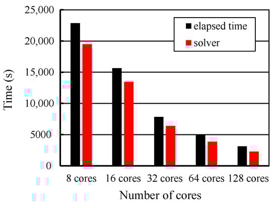 The computational performance was mainly examined. The elapsed time of this analysis was approximately 10 h, when we used a parallel computer of 64 cores. Though the computation of 64 cores is not significantly large, this elapsed time is short enough for practical use. This result shows the possibility of evaluating the seismic response of a whole soil-structure system using a high-fidelity model. Figure 8 shows the scalability of the computation, which is one of the most important performances of the HPC program. For this analysis, a shorter seismic input wave, which is extracted from the input seismic wave as 2.5 s duration including its principal shock, was applied. This result shows the scalability of elapsed time and the computation time of the solver is high. Moreover, the result also shows that the computation time of the solver occupied the majority of the elapsed time, which means that the development of the program presupposing the usage of the HPC solver works well.