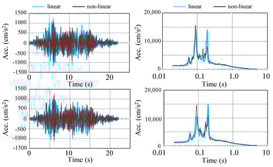 Acceleration time-histories and response spectra at two target points, with linear and non-linear analysis.