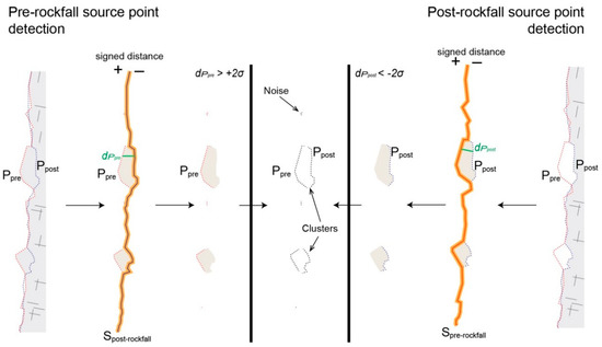 The changes between two point cloud acquisitions are identified by a classical method described in [40]. The detection of rockfall sources uses the difference in distance between two point clouds of different epochs. The computation of the difference is performed using a point-to-surface comparison to obtain the shortest distance (Euclidean distance) from each point to the surface as di = Δ(Pi, S), where (Pi) is, for example, a (i) point in the pre-rockfall event (pre) point cloud (P) of size (n), (S) is the surface built from the post-rockfall event (post) point cloud using the triangulation mesh, and (di) is the computed signed distance along the local normal of (S). If no acquisition bias exists in the point cloud, the distribution of distance differences without surface change follows a normal distribution centered on zero. In the locations at which a change in topography occurs, the distance comparison (di) must be larger than the standard deviation (σ). According to [5], the standard deviation of the measurements between two epochs can be high and depends on multiple factors, such as the quality of the point cloud datasets, the density of the points, the presence of vegetation, the roughness of the relief, and the quality of the alignment between the point clouds and/or the acquisition locations between the two epochs (LiDAR position or picture positions). According to [41], point cloud points are assumed to be indicative of topographic changes (i.e., here, a rockfall source) without ambiguity when the point-to-surface comparison distances are larger than two times the standard deviation (2σ). As proposed by [41], this threshold can be improved by applying a spatial filter using the mean point-to-surface comparison distance of a point and its 25 nearest neighbors. Thus, the thresholding conditions are defined as follows: