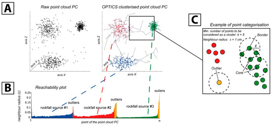 (A) Example of the raw dataset required to individualize the different clusters representing the different rockfall sources. (B) The OPTICS (ordering points to identify the clustering structure) density-based clustering algorithm allows classification according to the reachability distance or neighbor radius. (C) The classification allows attributing each point as a border or core point. Moreover, the OPTICS algorithm allows the identification of outlier points to remove.