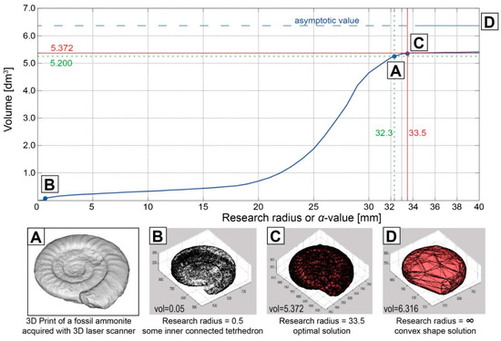 Example illustrating the way to find the optimal research radius that defines the α shape to compute the closer concave hull volume. The results are plotted on a research radius/volume chart. (A) Shows the print of a fossil ammonite. (B) Point cloud with a small research radius with inner connected tetrahedrons. (C) Shows the optimal research radius defined by the flexure of the curve. (D) Results with infinite radius leading to the convex hull.
