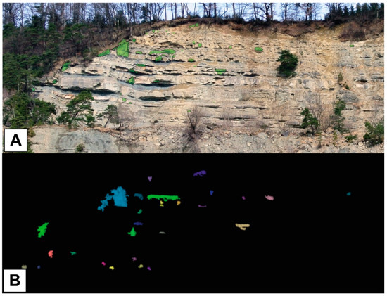 As an example, Figure 6A shows the observed and identified major rockfall events from sandstone beds between September 2012 and March 2013 during which the northern part of the cliff experienced important rockfall activity. Thirty-one rockfall events were identified via photographic comparison, mostly the important volumes. Figure 6B shows the identified rockfall sources after computation using the developed toolbox and applying the presented methods on the LiDAR data collected between September 2012 and March 2013. Each rockfall source belongs to a different-colored point cloud. In total, 49 individualized rockfall sources extracted with the presented procedure were identified. When comparing the two results, we noted that the difference in the identified number of rockfall events comes from the small undetected rockfall sources in the picture analysis.