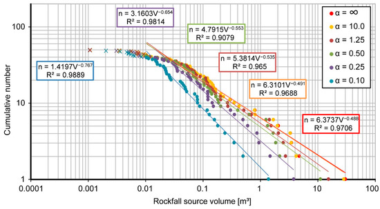 To illustrate the output results of the presented procedure, and particularly the computed rockfall volumes, we used the classic rockfall magnitude–frequency representation [22,31,33,34,35,36,37]. According to [37], volumes from rockfall source areas are assumed to follow a power-law regression: