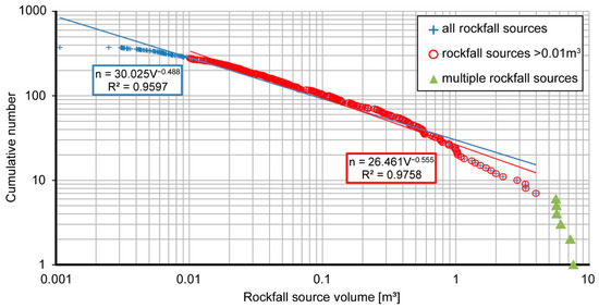 We applied the presented methodology to the overall monitoring period from 2010 to 2015 data. Thus, we identified 394 rockfall sources. Based on observation made on Figure 7, we applied on each of these rockfall sources a detailed assessment of the volume in order to compute close-to-reality volume, applying the method illustrated in Section 3.3 and Figure 4. As final result, we obtained a total volume of 105.2 m3, ranging from 0.0015 to 7.63 m3 with a mean volume of 0.2 m3 (see Figure 8). Less than 1% of the rockfall sources were smaller than 0.003 m3 (0.1 × 0.2 × 0.15 m), which is the smallest volume expected from structural analysis. Less than 25% of the rockfall sources are smaller than 0.01 m3 (0.2 × 0.2 × 0.2 m), which is the expected smallest volume identified without ambiguity from the point cloud. In Figure 8, the regression shown in red represents the rockfall sources with volumes higher than 0.01 m3, and the other regression shown in blue represents all volumes, including the smallest volumes. Green triangles were not included in the regression analysis because they represent multiple rockfall sources and were too scarce during the period of monitoring; thus, they were not considered to be representative [22,54]. We observed that the choice of the volume interval considered in the regression affects the a and b parameters. With distribution containing all rockfall sources, a increases and b decreases compare to distribution with only rockfall sources >0.01 m3.