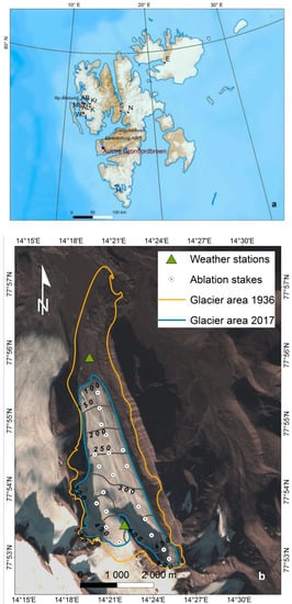The Svalbard archipelago is located in one of the most rapidly warming regions on Earth and undergoes an increase in average summer temperature and duration of melt period along with the impacts of early summer and late autumn rainfalls. For the moderate emission scenario RCP4.5, a warming of 5–8 °C and a precipitation increase of 20–40% is predicted for Svalbard by 2100, relative to the period of 1986–2005. Svalbard glaciers are expected to lose ~50% of their mass by 2100 []. Glaciers cover ~57% of the land area of Svalbard [] and, if melted, could potentially contribute 17 ± 2 mm to global sea-level rise [].