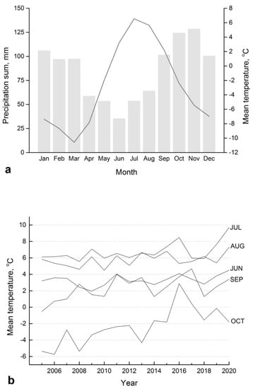 (a) Mean monthly temperature and precipitation values from 2005 to 2019 recorded on AWS Barentsburg; (b) Mean temperature values of the warmest months from 2005 to 2019.