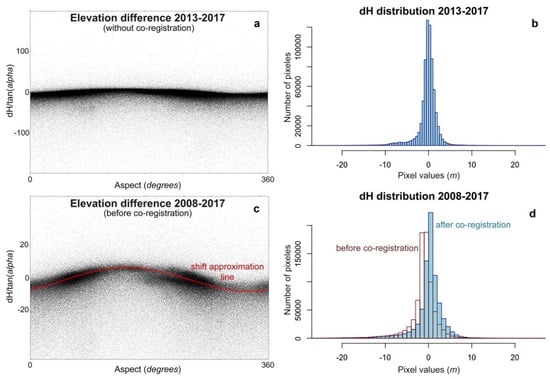 Elevation difference distribution before and after co-registration. (a) Elevation difference 2013–2017. The shift between two DEMs was considered as negligible. Then co-registration procedure was not applied; (b) dH distribution 2013–2017; (c) elevation difference 2008–2017. Sinusoidal shift approximation line shows the necessity of co-registration application; (d) dH distribution 2008–2017.