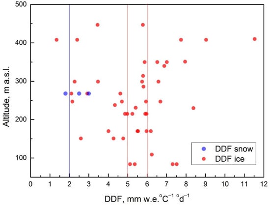 Temperature and precipitation are not the only factors affecting the glacier mass balance, though the role of air temperature is explained by the fact that it is a universal characteristic of almost all components of the heat balance []. In fact, the overall mass change is determined mainly by the energy balance at the glacier surface. Thus, as a simplification, DDFs physically parameterize energy balance components that have an influence on melting. Individual energy components that provide energy for melting vary in space and time, and thus DDF meanings are different for individual glaciers [], and therefore the degree-day approach does not accurately represent the spatial variability of melt over the entire glacier surface. Reported values of degree-day factors of glaciers and snow-covered basins can be found in [,]. At the same time, the DDFs used at a century timescale and that remained stable until the mid of 1970s have decreased by 7% per decade []; therefore, DDFs must be used with caution and only for reconstructing changes over short periods of time.