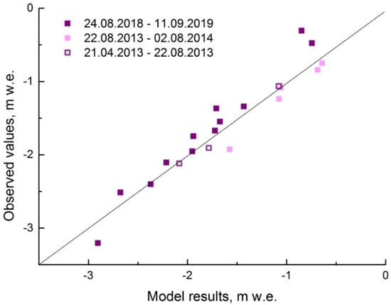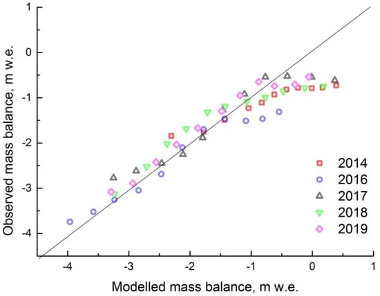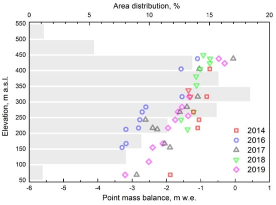 Regarding the mass balance values obtained by the glaciological method in different studies, the discrepancy may be caused by several factors: the approach used to interpolate mass balance over the entire glacier area, the values of ice and snow density that is used for calculating accumulation and ablation into a water equivalent and averaging the winter mass balance value over several years, accounting for glacier area change. In [], calculation of mass balance was carried out for four altitude zones. Surface ablation values were averaged in each altitude zone based on the stakes data. The density of ice was taken to be equal to 0.88 kg m−3. The snow accumulation was also averaged for each altitude zone, and four values were used for the entire period of mass balance record. All the values of net mass balance were calculated assuming that the balance year ends on 15 August. In this study we accounted for the glacier area decrease in each altitude zone, while in [], it was considered constant. The glacier area recession was 15% in 2014–2020, and when such a change is not taken into account, a difference in mass balance calculation of 0.55 m w.e. a–1 is obtained.
