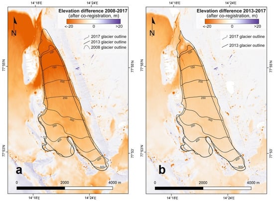 The geodetic mass balance of Austre Grønfjordbreen was calculated for two periods: 2008–2017 and 2013–2017. The digital elevation models (DEMs) 2008–2017 were co-registered using a procedure suggested by Nuth and Kääb [], and then DEMS of 2008, 2013 and 2017 were subtracted by pairs (2008–2017 and 2013–2017) to derive the difference in surface elevation for these two periods. The geodetic mass balance for 2008–2013 was calculated after deriving the values for 2013–2017 and 2008–2017.