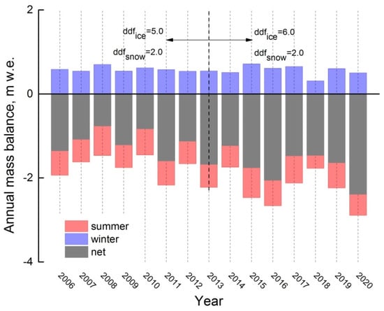 The model and reconstruction results were calibrated according to the stake measurements. Thus, the glaciological and modeled mass balances are in agreement for the calibration period. The reconstructed values of annual mass balance from 2014 to 2019 by day-degree method are 0.02 m w.e. a–1 more negative than what was estimated using the glaciological methods. If using the DDFs = 6.0 and 2.0 mm °C−1 d−1 for ice and snow, correspondingly, the geodetic balance is less negative than reconstructed by the DDF model. The mean difference is 0.33 and 0.10 m w.e. a–1 for 2008–2013 and 2013–2017, respectively. Therefore to make a better fit with geodetic results for 2008–2013, we calibrated DDFs again and used DDFice = 5.0 mm °C−1 d−1 and DDFsnow = 2.0 mm °C−1 d−1 (the mean difference is 0.01 m w.e. a–1).