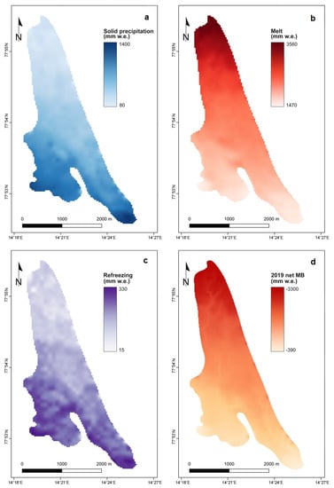 Spatially distributed mass balance components: (a) solid precipitation; (b) melt; (c) refreezing and (d) net mass balance averaged for 2019 balance year.