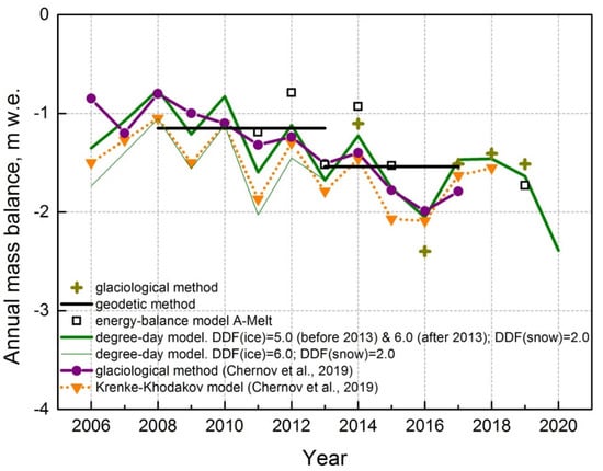 The mean mass balance differences between the geodetic and energy-balance approaches for the periods 2013–2017 and 2008–2013 are 0.22 m w.e. a–1 and 0.16 m w.e. a–1, respectively. We assume that a more accurate result can be reached using a more complex energy-balance model, compared to a DDF-approach using one set of parameters for the entire period of reconstruction. The DDF-approach requires the regular calibration of parameters and comparison with other methods, but it is useful as an approximation, and such meteorological parameters as temperature and precipitation are still more accessible for calculation.