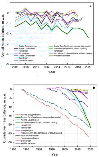 (a) The net balance throughout the monitoring periods for 12 glaciers including modelled annual mass balance of Austre Grønfjordbreen; (b) the cumulative mass balance throughout the monitoring periods for 12 glaciers modified from Schuler et al. [,].